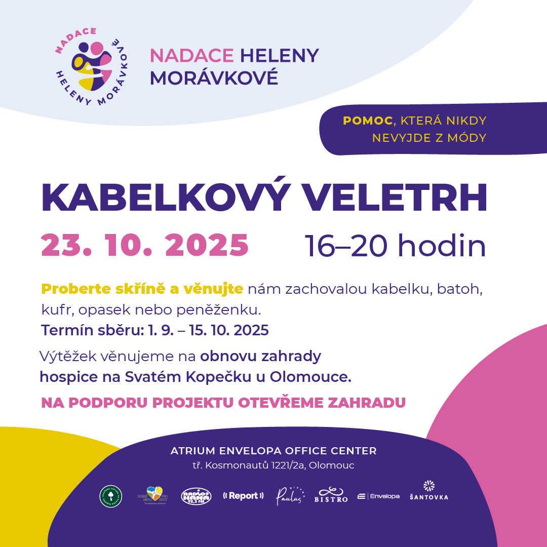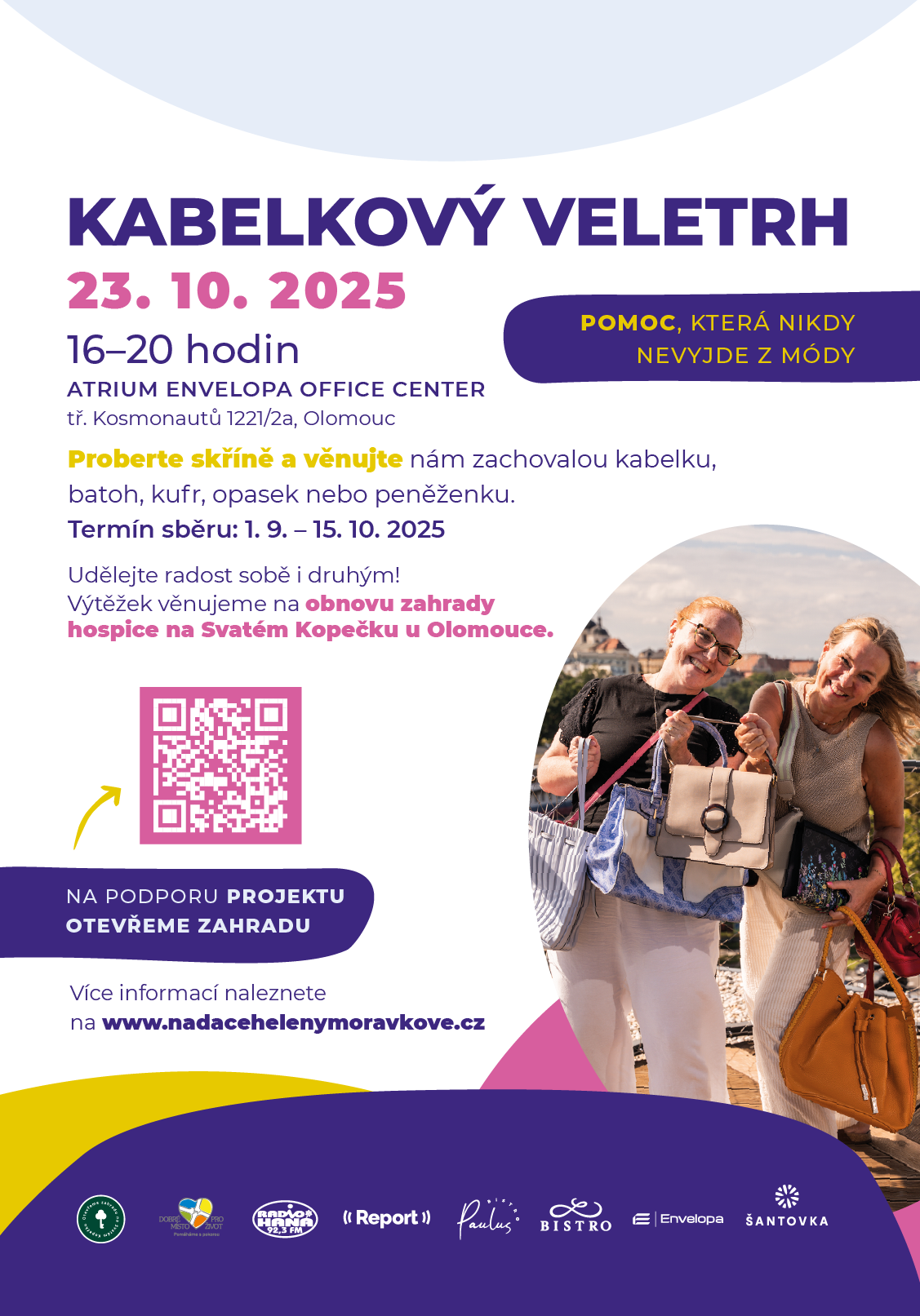 Dejte kabelkám druhou šanci a přispějte na dobrou věc! Zveme vás na charitativní Kabelkový veletrh, jehož výtěžek půjde na podporu projektu Otevřeme zahradu. Jde o projekt olomouckého spolku Dobré místo pro život, který má za cíl obnovu zahrady Hospice na sv. Kopečku u Olomouce. Čeká na vás jedinečná nabídka zánovních kabelek, batohů, peněženek a opasků, které mohou znovu udělat radost – a zároveň pomoci.