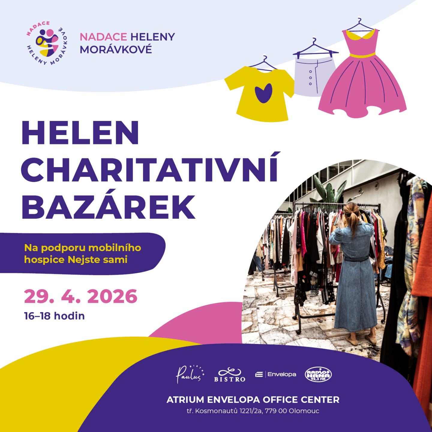 Udržitelná móda s přesahem pomoci se opět stane hlavním motivem našeho Helen charitativního bazárku. Letos se uskuteční ve středu 29. dubna už tradičně v atriu Envelopa Office Center v Olomouci a výtěžek věnujeme mobilnímu hospici Nejste sami.
